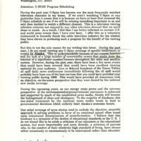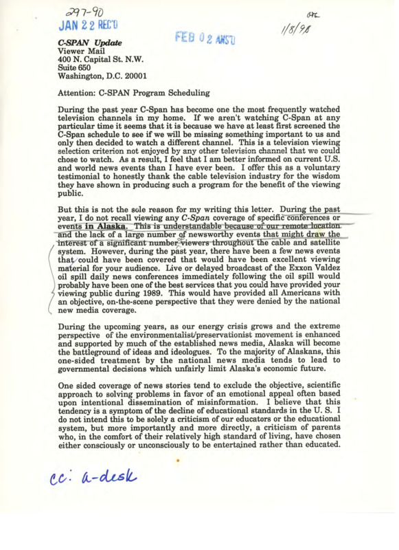 Expresses gratitude for C-SPAN and states there is little coverage on events in Alaska, then suggests covering the upcoming International Conference on the Role of the Polar Regions in Global Change.