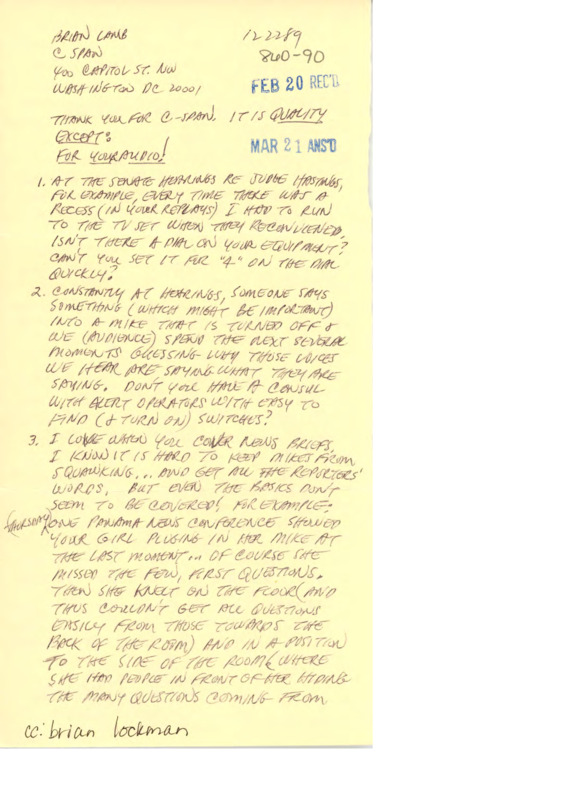Lays out a long list of compliments for C-SPAN programming, with some suggestions.
