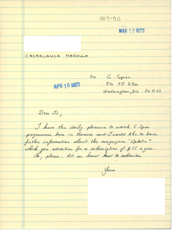 Asks for further information on how to get the C-SPAN magazine "Update."