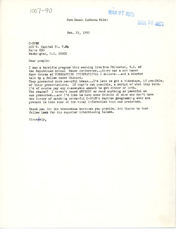 Requests a videotape of a recent program from the Republican Annual House conference.