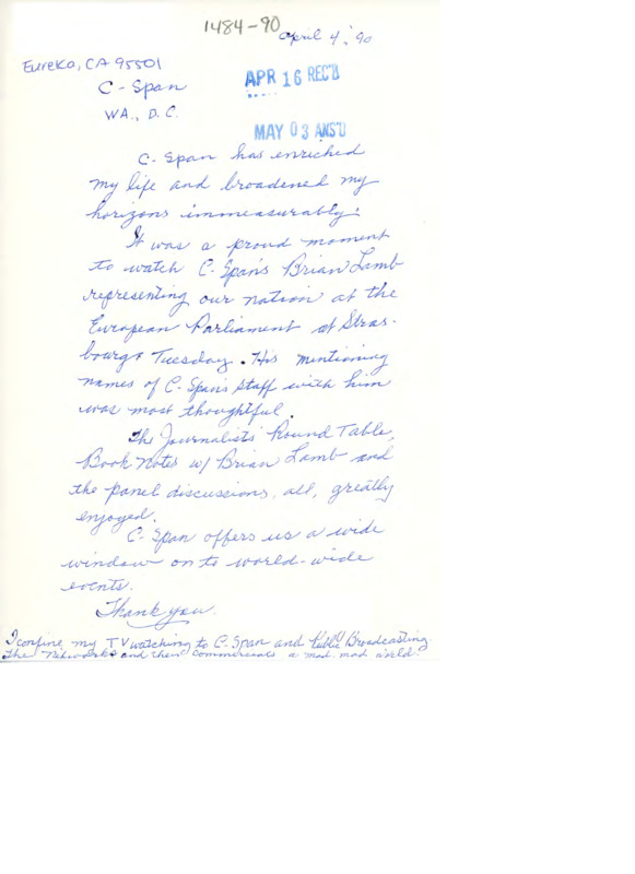 Letter to C-SPAN, 1990-04-04; 95501