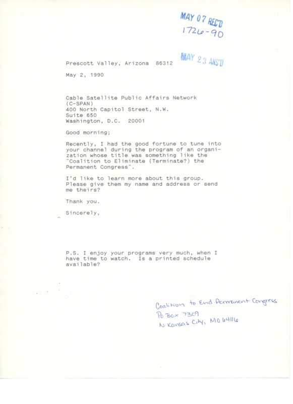 Letter to C-SPAN, 1990-05-02; 86312