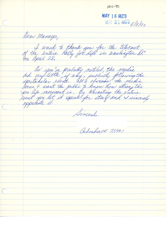 Letter to C-SPAN, 1990-05-08; 73401