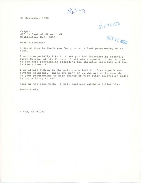 Letter to C-SPAN, 1990-09-21; 92083