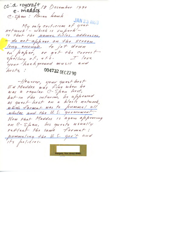 States complaint that names of C-SPAN guests do not appear on screen long enough and discusses dislike of guest host Ed Maddox based on his hosting of another network.