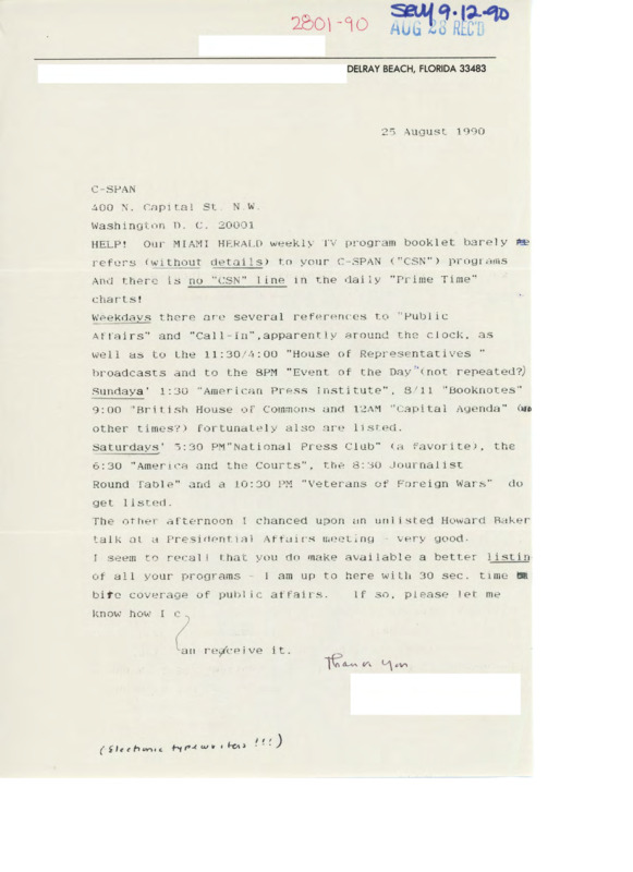 Letter to C-SPAN, 1990-08-25; 33483