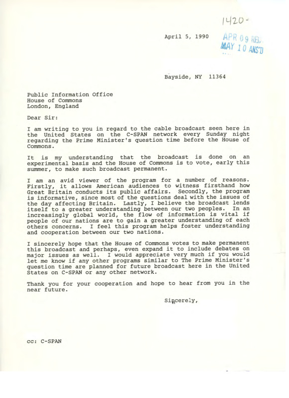 Letter to C-SPAN, 1990-04-05; 11364