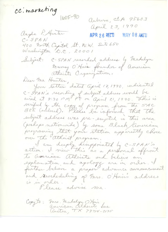 Expresses disappointment that coverage of the American Atheists' Organization speech was preempted by another program and asks for an apology.