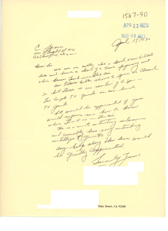 Describes cable setup and asks for information on how to know when Brian Lamb is on the air.