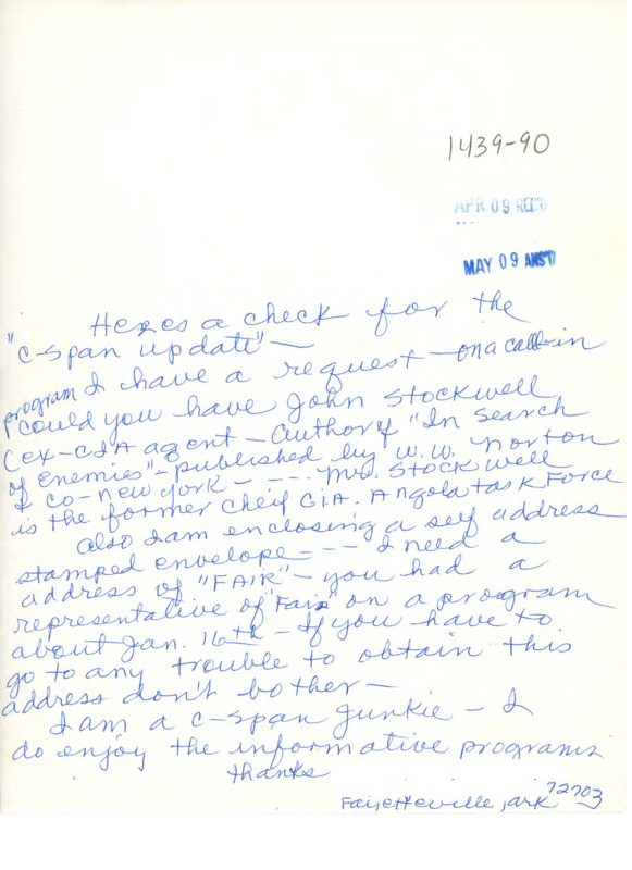 Submits a check for a subscription to C-SPAN Update and asks for the address of FAIR (Fairness and Accuracy in Reporting) and if John Stockwell could be on the program.