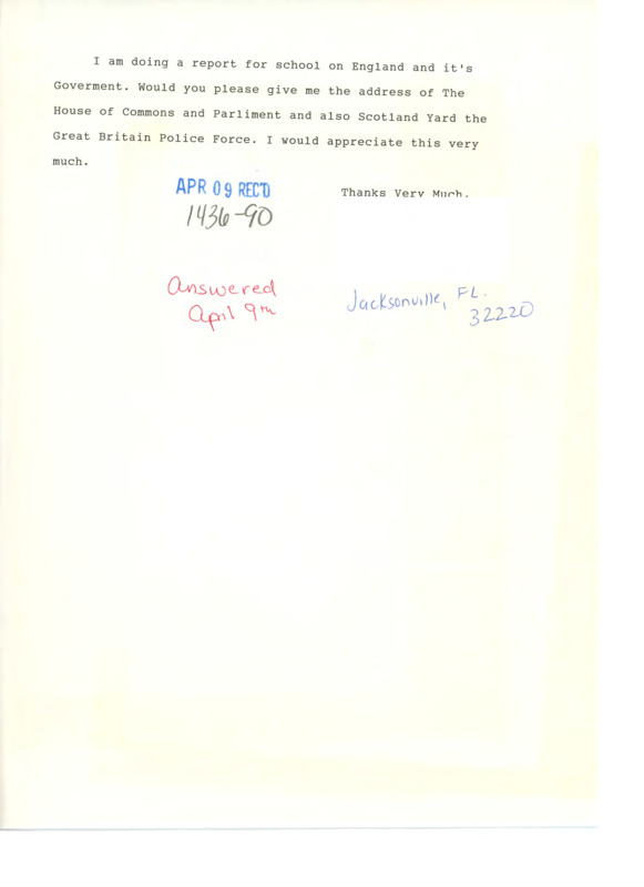 Requests the address of the House of Commons, Parliament, and Scotland Yard for a school report.