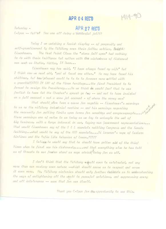 Thanks C-SPAN for airing a military celebration then criticizes the celebration for excess.