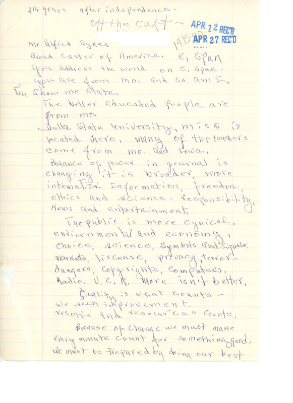 Addresses comments to Mr. Alfred Sykes, a panelist on C-SPAN, and expresses a number of opinions on domestic and world affairs, including on human rights, healthcare, and social norms.