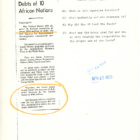 Includes a photocopy of an article on debt relief of African nations from a San Francisco paper and poses four questions about the funds.