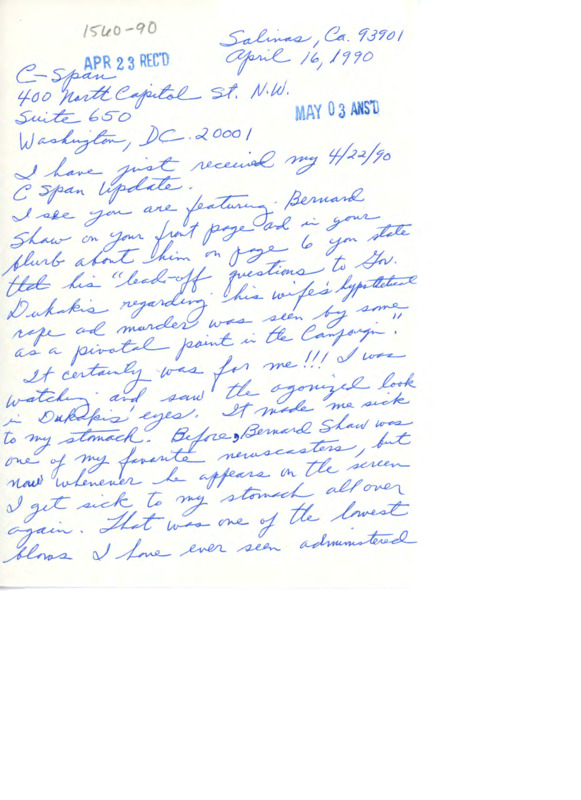 Expresses dislike of newscaster Bernard Shaw's coverage of the Dukakis campaign.