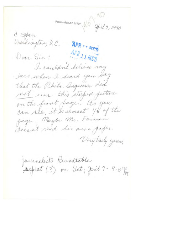 Encloses clipping of the Philadelphia Enquirer to counter a report made on C-SPAN that it did not run a particular photograph.