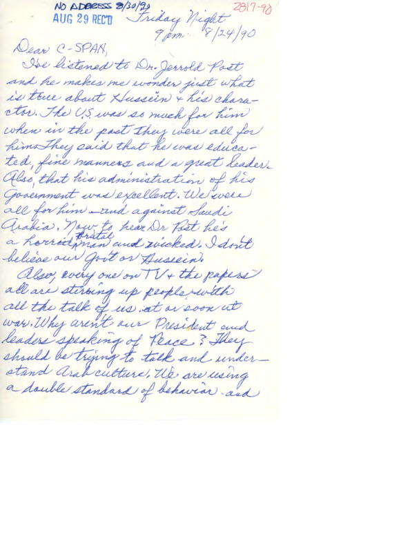 Expresses concerns about Saddam Hussein and news discussions on war.