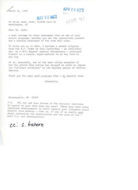 Expresses disappointment in coverage of John Hull case and encloses a clipping.