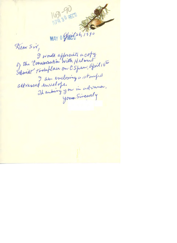 Requests a copy of the "Conversation with Helmut Schmidt."