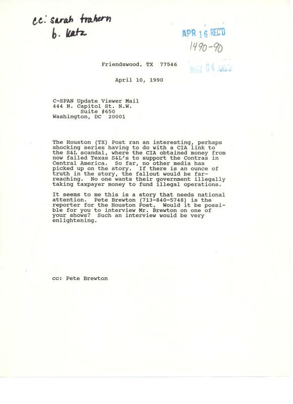 Describes a story on the CIA and S&L scandal which appeared in the Houston Post and states opinion it needs to be widely reported.