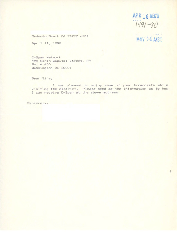 States enjoyment of watching C-SPAN while in D.C. and asks how to receive C-SPAN at current address.
