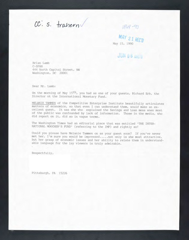 Suggests Melanie Tammen of the Competitive Enterprise Institute as a potential guest.