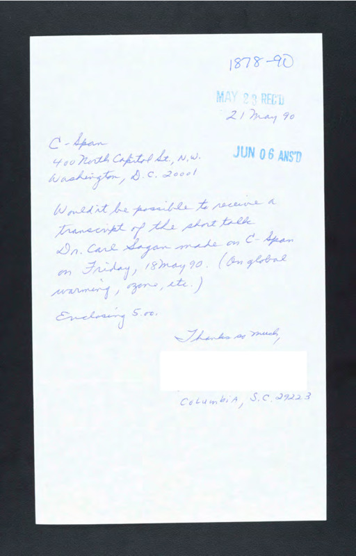 Asks if it's possible to get a transcript of a talk by Dr. Carl Sagan.