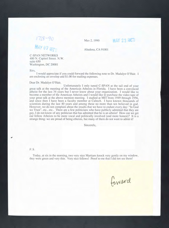 Includes a letter to Madalyn O'Hair of the American Atheists requesting to join the organization.