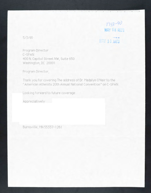 Thanks C-SPAN for airing Madalyn O'Hair's speech at the American Atheists Convention.
