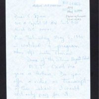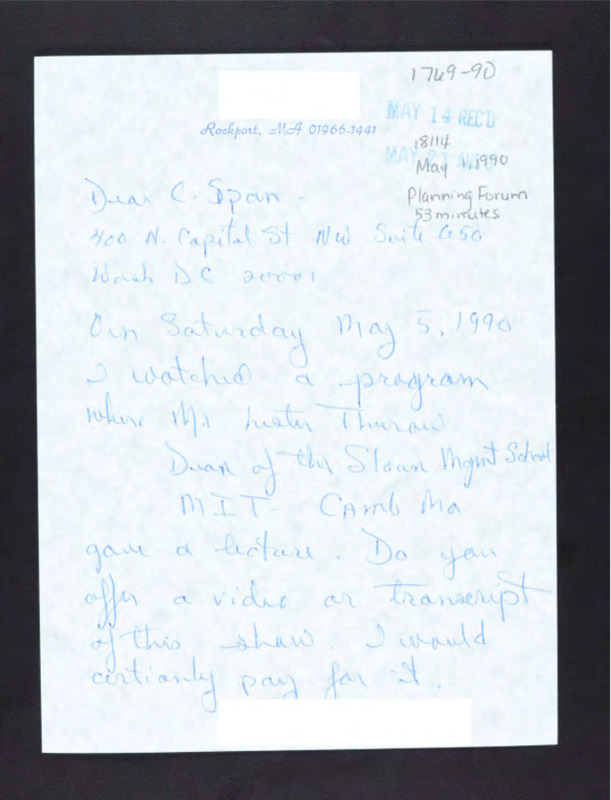 Asks for a video or transcript of a program featuring Lester Thurow.
