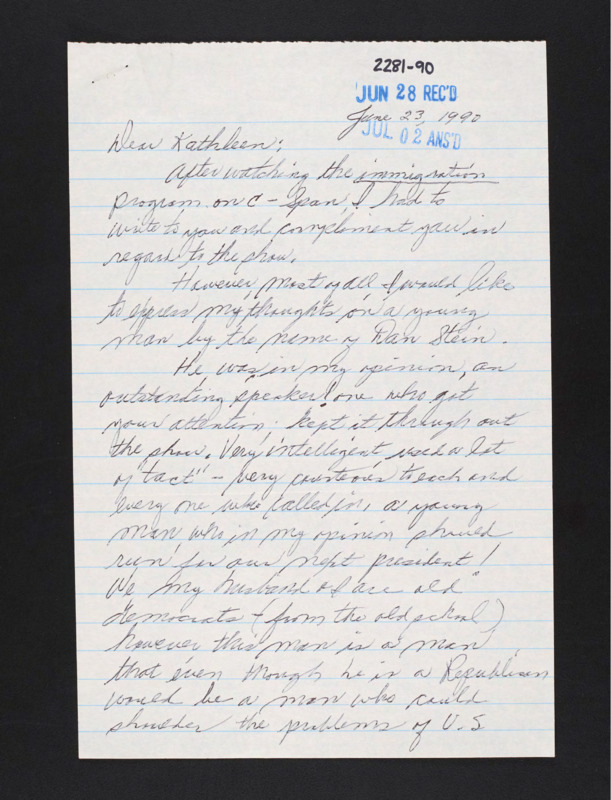 Expresses thanks for a program on immigration and praises Dan Stein, a guest on the show.