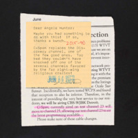 Includes clipping announcing changes to local cable stations and expresses pleasure at the changes.