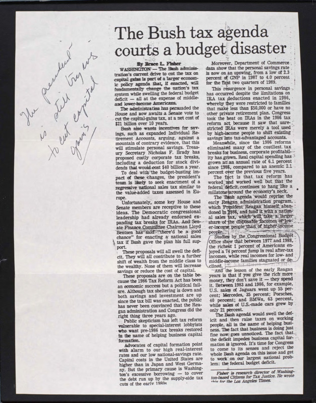 Supports C-SPAN and offers comments on the Iran-Contra affair, incumbent politicians, the S&L scandal, and others. Encloses articles on taxes, CNN, and C-SPAN.