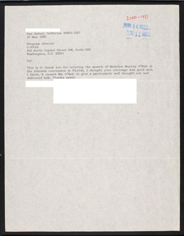 Thanks C-SPAN for airing Madalyn O'Hair's speech at the American Atheists Convention.