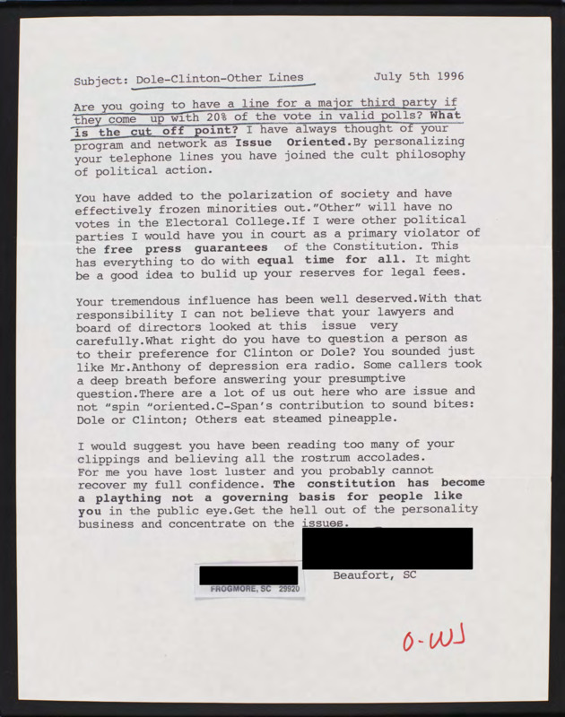 Wonders when third-parties will be included in call-in lines and believes C-SPAN is contributing to polarization.