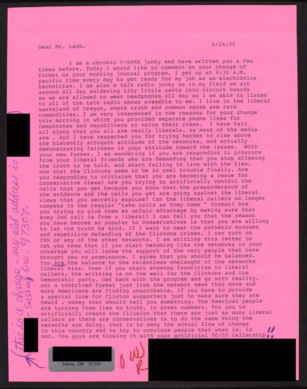 Questions the division of the phone lines by political party and believes C-SPAN is bowing to pressure from liberal "friends."