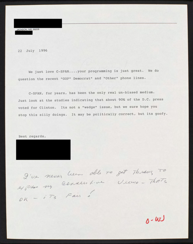 Expresses their hope that C-SPAN will discontinue the use of different phone lines for political parties because they think it skews perception of popularity.