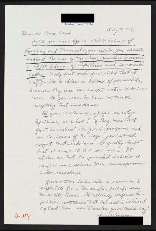 Letter to C-SPAN, 1996-07-07; 77024
