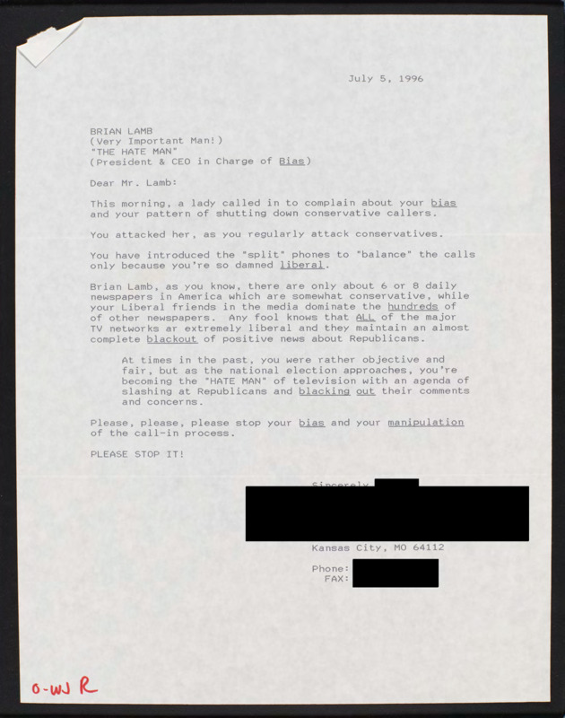 Accuses Brian Lamb of being liberal and attacking conservative callers, believes the majority of the media is liberal, and says C-SPAN should stop their bias.