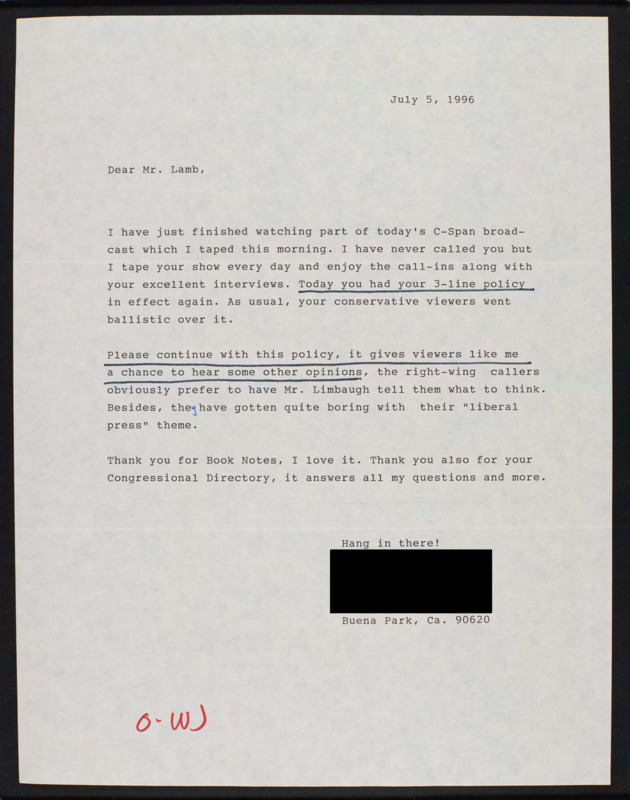 Letter to C-SPAN, 1996-07-05; 90620