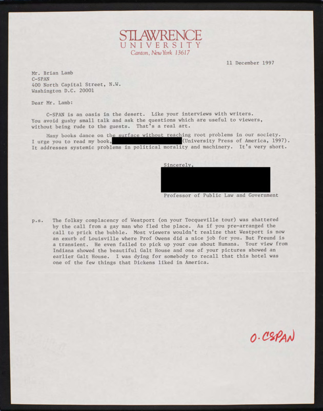 Praises C-SPAN, recommends their book on political morality, and comments on one segment of the de Tocqueville series.