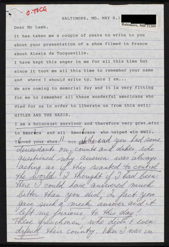 Expresses outrage at comments made in the de Tocqueville series about the United States' involvement with foreign nations and recounts their time serving in World War II.