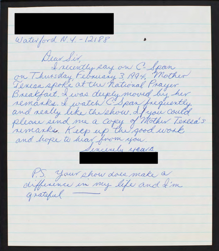 Asks for information about obtaining video of Mother Theresa's speech at National Prayer breakfast.