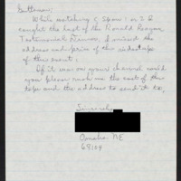 Asks for information about obtaining tape of Ronald Reagan tribute.