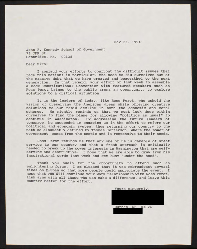 Expresses support for Ross Perot following a speech about the national debt, compares him to the Founding Fathers.