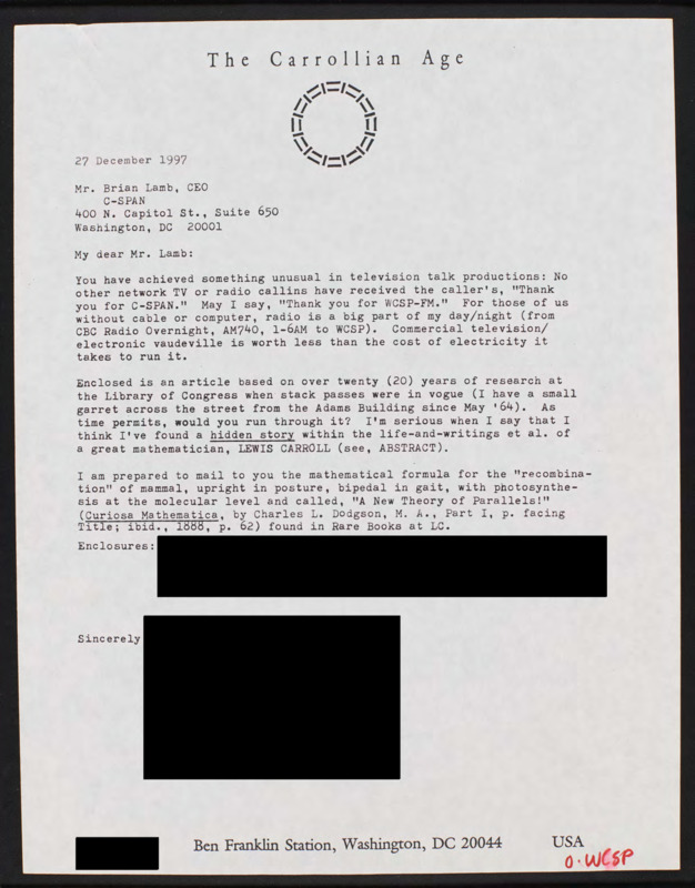 Thanks C-SPAN for their radio broadcasting and encloses an article they have researched regarding Lewis Carroll.