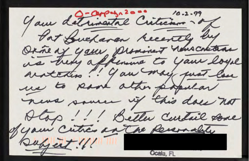 Takes offense at criticism of Pat Buchanan given by a C-SPAN commentator and suggests said individual be curtailed.