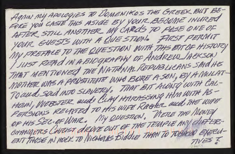 Discusses a section of history on Andrew Jackson and questions the moralities of tobacco executives, and encloses an illustration of individuals being driven out of a building.