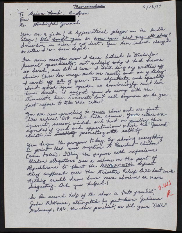 Accuses C-SPAN of being like radical GOP radio talk shows and no l onger accepting other views, believes they were negative about Bill Clinton, and states they will no longer watch Washington Journal.