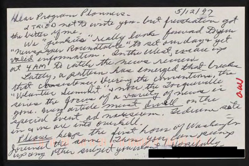 Expresses frustration that the journalists' program is being preempted for Tocqueville and other programs.